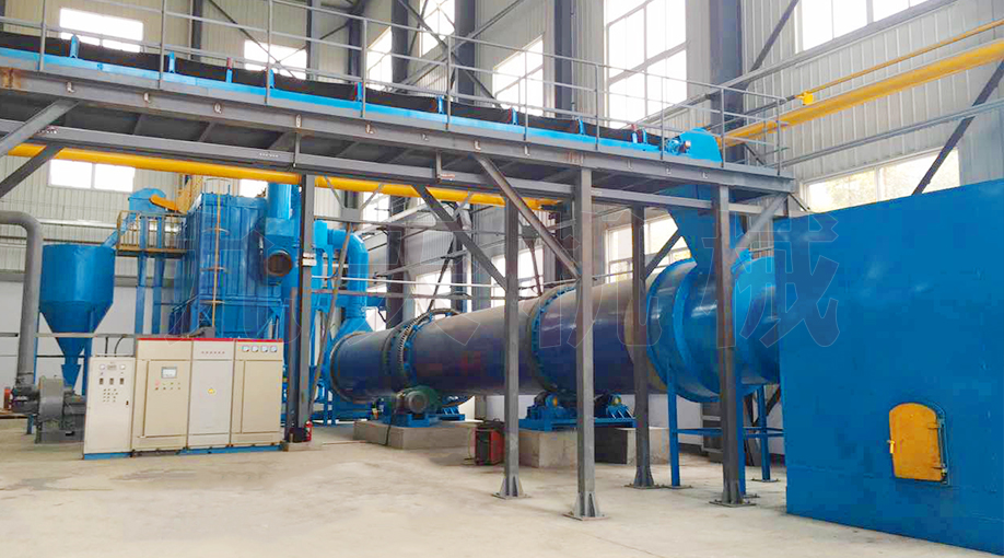 汙泥由給料機經溜(liū)槽進入幹燥機內導料(liào)板上,隨著筒體的轉動(dòng),汙泥被送到傾斜揚料板上後,被提升(shēng)到筒體的中心位置,逐漸(jiàn)灑落形成料幕,高溫氣流從(cóng)中穿 過,使汙泥預熱並蒸發部分水分。當汙泥灑落、移動到活動(dòng)的篦條式(shì)翼板上(shàng)時,預熱過的篦(bì)條式翼板與物料夾雜在一起,將(jiāng)熱量傳給物料(liào),使部分水分蒸發。同時,翼板夾帶物料提起、灑落,重複(fù)多次,物料與熱氣(qì)流進行熱交換。同時埋在(zài)物料中的清掃裝(zhuāng)置,也沿圓弧形揚料板的裏側(cè)下滑,把揚料板內壁粘(zhān)附(fù)的物(wù)料清掃下來。 當清掃裝置隨筒體轉過垂直線以(yǐ)後(hòu),又在圓弧揚料板背麵拖動,將其粘附在揚料板外壁的物料清掃下來(lái)。隨(suí)著筒體的不斷轉動,部分水分蒸發,汙泥得到進一步幹 燥。同(tóng)時(shí),清掃裝置(zhì)對汙泥團球(qiú)也起到了打碎作用,提高了幹燥速度,最後汙泥烘(hōng)幹後(hòu)變成低水分的鬆散物料(liào),由出料(liào)口排出。